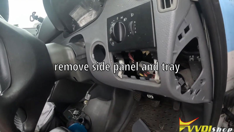 With the door open, we targeted the EIS. Using a dedicated EIS removal tool, we accessed it through the dash tray – the easiest route on this model.