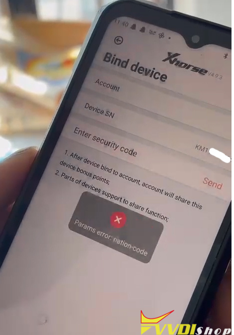 Tried to bind Xhorse Dolphin XP005L key cutting machine with Xhorse App. But App displayed a Params error: nation-code. How to fix it?