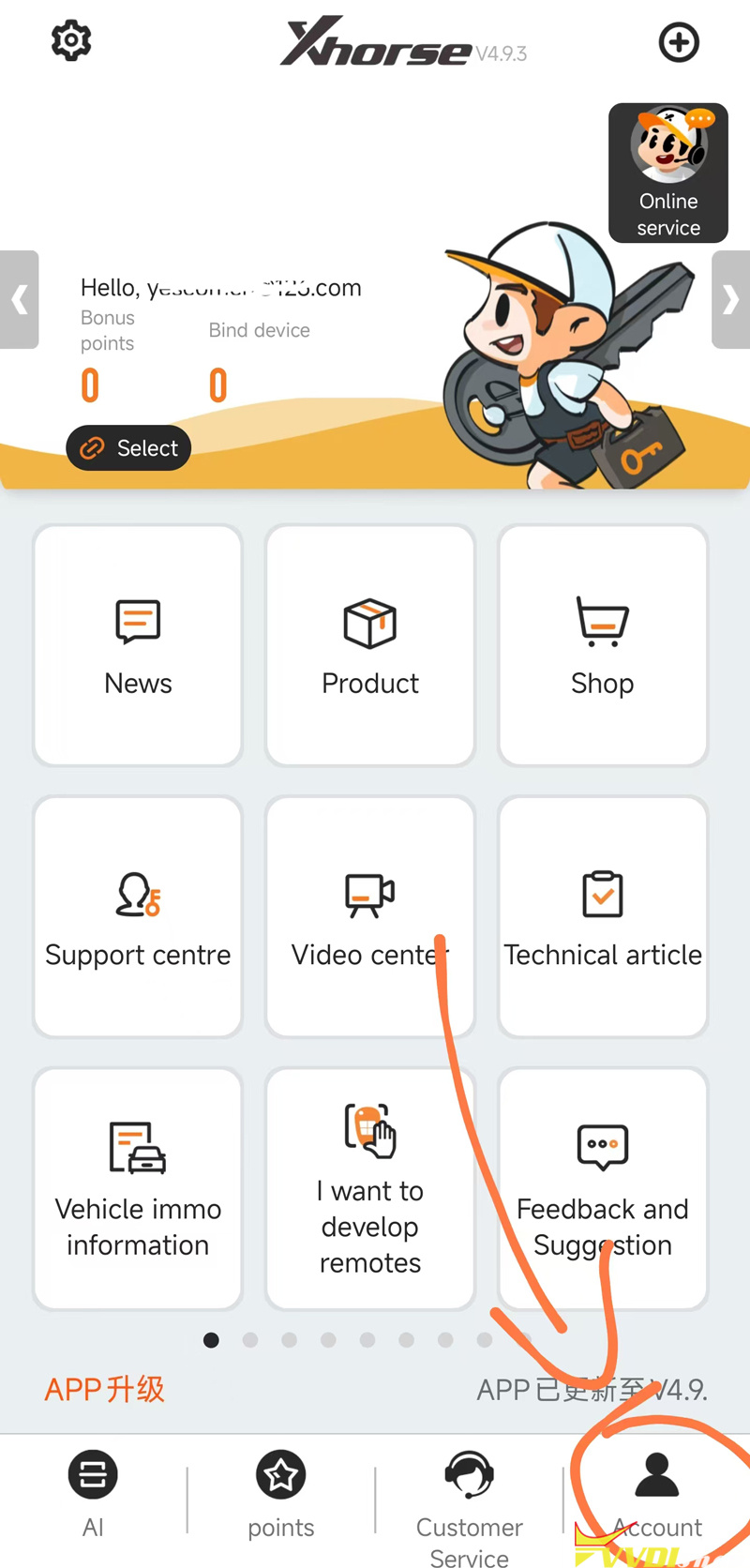 In Xhorse App, go to Account. Register an Xhorse account and login.