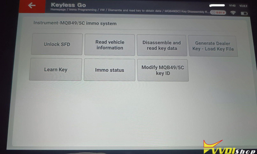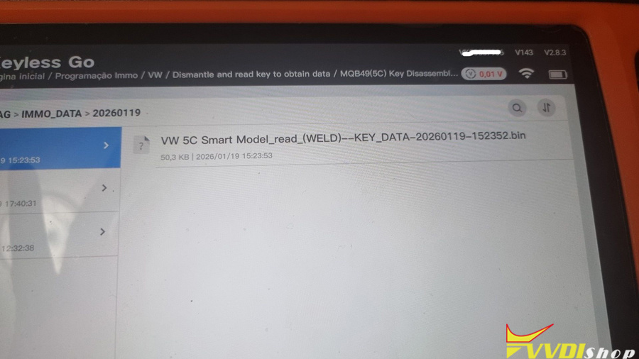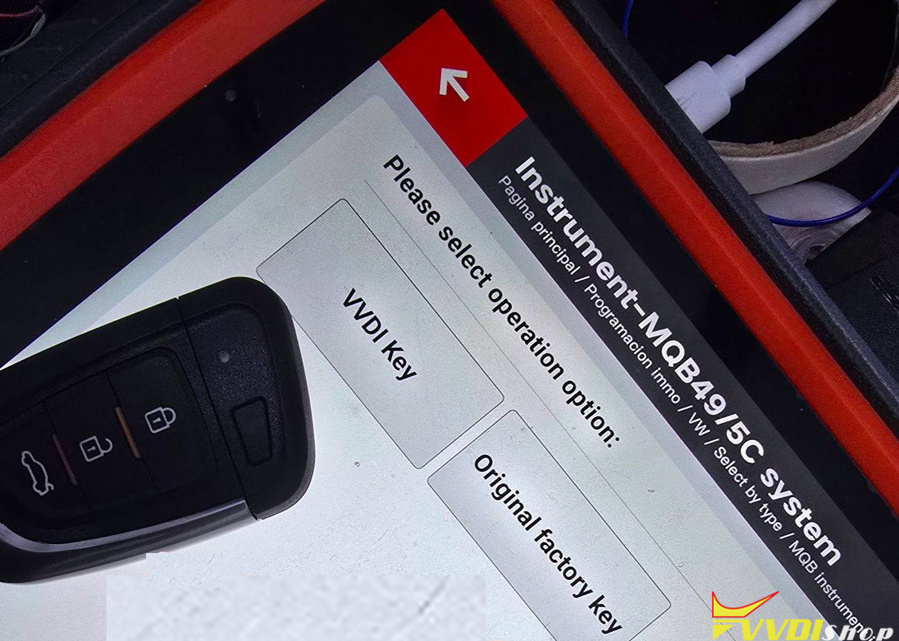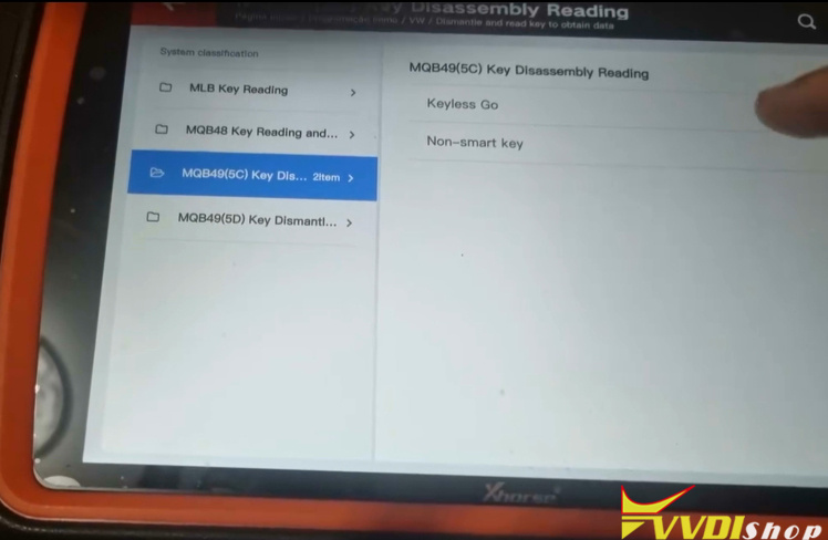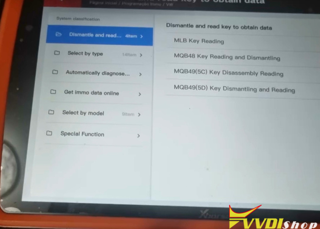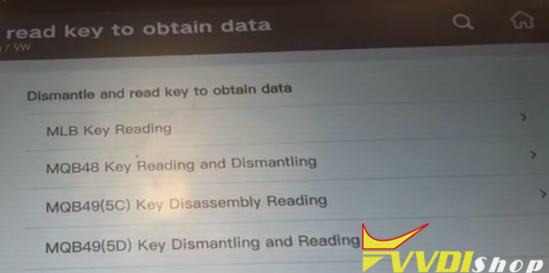 Menu path: IMMO Programming- VW- Select by type- MQB instrument- read key to obtain data – MQB49 (5C) key disassembly reading or MQB49 (5D) key dismantling and reading.