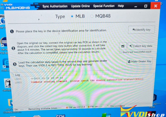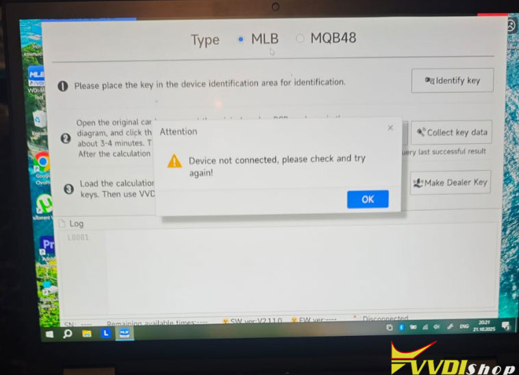 Failed to use Xhorse VVDI MLB Tool MLB function. The system says the device is not connected. Any solution?